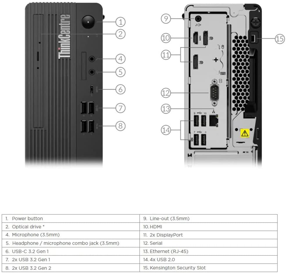 - Puertos frontales: 1 conector combinado de auriculares/micrófono (0.138 in); 2 USB 3.2 Gen 2; 1 USB-C 3.2 Gen 1; 1 micrófono (0.138 in); 2 USB 3.2 Gen 1 | Puertos traseros: 1 serie (9 pines); 2 DisplayPort; 1 HDMI; 4 USB 2.0; 1 Ethernet (RJ-45); 1 línea de salida (3) (1.201 in) | Chip de seguridad: TPM discreto 2.0, certificado TCG