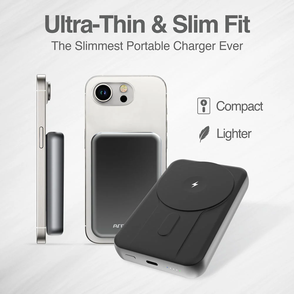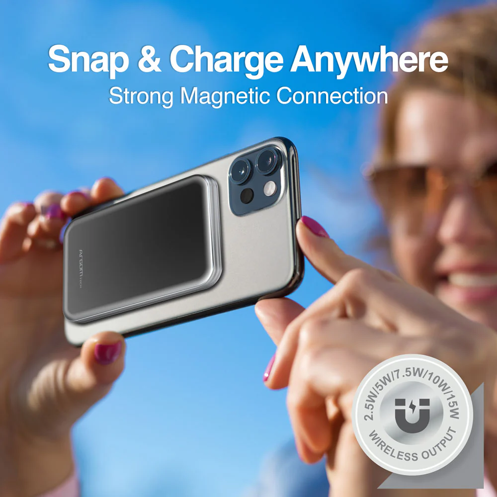 Carga tu día con la batería externa magnética MS10 de aluminio de 10 000 mAh, una solución de carga versátil y compacta diseñada para quienes necesitan energía confiable en cualquier lugar. Con una batería de polímero de litio de 10 000 mAh que proporciona hasta 4 cargas adicionales para dispositivos compatibles, esta batería externa cuenta con carga inalámbrica magnética de 15 W y carga rápida PD de 20 W a través de USB-C. Su elegante diseño de aluminio y su microchip inteligente garantizan una carga segura y eficiente para todos tus dispositivos.